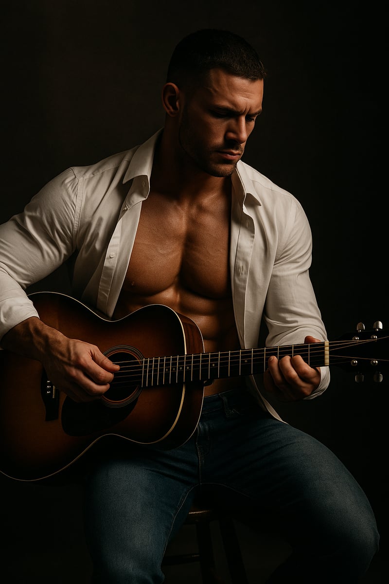 Scene: Wooden stool, paint-splattered backdrop, guitar or instrument