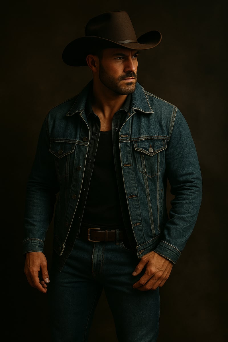 Look: Fitted jeans, open plaid shirt, cowboy hat, boots